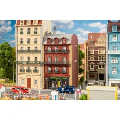 This typical rusty red townhouse, which extends over four floors, delights with its elegant black metal railings and a shoemaker shop on the ground floor It is the perfect addition to any row of houses and enriches your miniature city backdrop with a charming, urban flair, Manufacturer: Faller