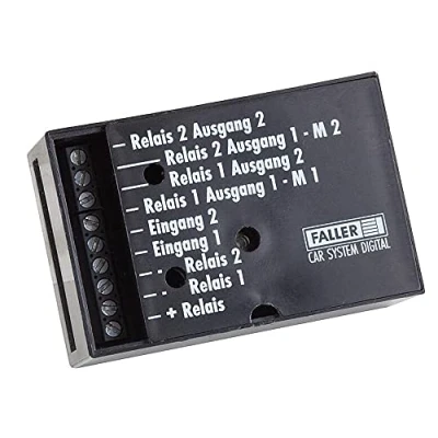 Gauge H0, N, item group: technology scenarios. Module, consisting of 2 relays (12 V DC) on a small circuit board that can be plugged in bridges (so-called Jumper) allows you to trigger different actions on the model system. - To the traffic control "Traffic-Control", item no. 161651 or the "expansion module", item no. 161352 connected, e.g. a smoke generator, item 180690 or a synchronous craft motor, item no. 180629 (AC voltage). - Connected to an "expansion module", a motor can be operated in the forward rotation by connecting the bridges with one of the outputs and with another output the motor in reverse. - Similarly, the module has the possibility to connect different digital systems without potential: one of the systems switches the relay and this switching signal is processed in another system. - By plugging the bridges, two signals can be made from one signal: since one contact and one contact of the relay is used, depending on whether the relay is tightened or opened, either the one or the other contact is closed. By connecting the relay module, a signal reversal is also possible. International products have separate terms, are sold from abroad and may differ from local products, including fit, age ratings, and language of product, labeling or instructions., Manufacturer: Faller