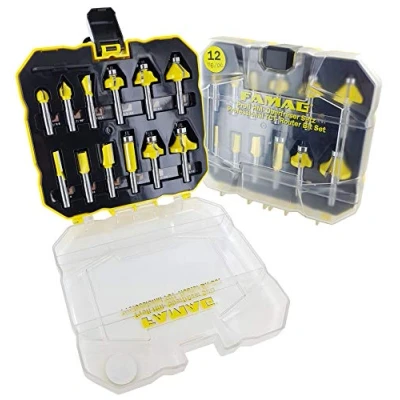 High-quality FAMAG professional line carbide milling set, 12 pieces in plastic box Contents: 1 flush cutter with ball bearing (diameter 12.7 mm, NL 25.4 mm), 1 prong cutter (diameter 14.3 mm, NL 12.7 mm), 1 V-slot cutter (diameter 12.7 mm, 90 °) 1 x groove cutter (diameter 12 mm, R 6 mm), 1 x groove cutter with ball bearing (diameter 21 mm, R 6 mm), 3 x slot cutters (diameter 8, 12, 16 mm, NL 20 mm) 2 rounding cutters (diameter 24.7 mm, R 6 + diameter 32.7 mm, R 9.5 mm); 1 edge cutter (diameter 28.6 mm, 45°); 1 profile cutter (diameter 27 mm, R 4 mm) The cutters have a shaft diameter of 8 mm and are equipped with BG-compliant labelling. Made in Germany, Manufacturer: Famag