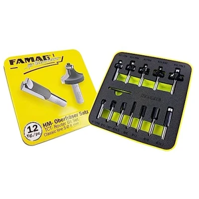 High-quality FAMAG carbide cutter set, classic line, 12 pieces in metal box Contents: 1 flush cutter with ball bearing (diameter 12.7 mm, NL 25.4 mm), 1 prong cutter (diameter 14.3 mm, NL 12.7 mm), 1 V-slot cutter (diameter 12.7 mm, 90 °) 1 x groove cutter (diameter 12 mm, R 6 mm), 1 x groove cutter with ball bearing (diameter 21 mm, R 6 mm), 3 x slot cutters (diameter 8, 12, 16 mm, NL 20 mm) 2 rounding cutters (diameter 24.7 mm, R 6 + diameter 32.7 mm, R 9.5 mm); 1 edge cutter (diameter 28.6 mm, 45°); 1 profile cutter (diameter 27 mm, R 4 mm) The cutters have a shaft diameter of 8 mm and are equipped with BG-compliant labelling. Made in Germany, Weight: 1.5873282864 Pounds, Manufacturer: Famag