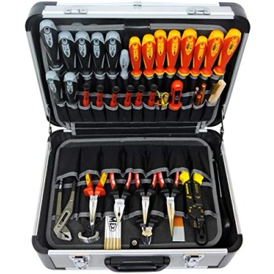 ✅ THE WORKKING TOOL: High-quality tool box with particularly strongly sized aluminium profiles as a middle frame and in the longitudinal edge area. The aluminium profiles are made of aluminium (not aluminium coloured plastic). Extra strong hinges and clasps. The tool box is therefore extremely robust and is characterised by its high quality. The tool box is lockable. Storage box with a single bag: the tool box has two removable tool pallets for your tools. They are fixed in the tool box with Velcro brackets and rotary locks to ensure a perfect hold. The top palette can hold a total of 27 pockets on the front as well as 15 pockets on the back. 14 more pockets are on the bottom palette. Large storage space: As shown in the demo picture, the pockets of the tool case offer enormous space for your tools. In addition, there is a variable compartment division in the bottom of the case, in which additional tools can be stored. So your tools can be stored individually and above all safely. Features: The tool box is thoughtfully designed and designed for demanding users as well as for commercial use. All profiles are screwed (not nailed as with standard aluminium cases), the base of the base lid and side surfaces is reinforced with MDF panels (no cardboard as with affordable aluminium cases). The construction is made of high-quality materials, weight-optimised and elastic. This makes the case particularly heavy duty with a comparatively low weight. Dimensions: 46 x 35.5 x 18 (L x W x H), weight approx. : 3.93 kg - recommended load for dynamic use 15 kg, maximum total weight 30 kg, Manufacturer: FAMEX