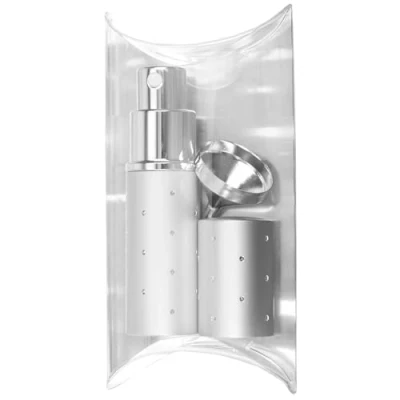 Empty pocket sprayer for 10 ml capacity Silver with silver detailing and glass insert Included with small funnel for refilling Includes with silver funnel Includes glass insert