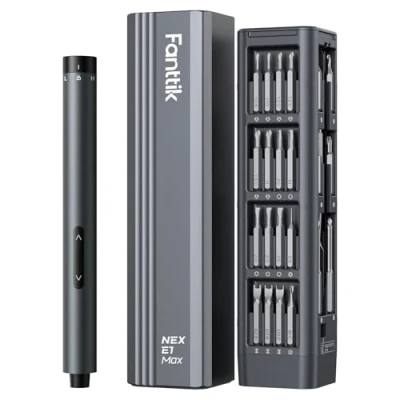 JoybuyThe Fanttik E1 Max Mini Electric Screwdriver Set features a high-precision 200 RPM motor with adjustable torque, 50 magnetic S2 steel bits, a long-lasting rechargeable battery, and an award-winning aluminum alloy design—perfect for detailed repairs on electronics and gadgets.