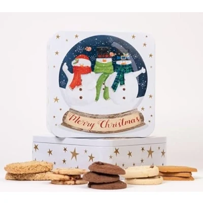 A gorgeous, heavily embossed rectangle tin filled with Finest Snowman Snowglobe Traditional Embossed Selection of Oat Flips, Salted Caramel, Chocolate Chunk & Orange, Currant Shrewsbury & Mild Ginger Biscuits No Artifical Colours & Preservatives Suitable for Vegetrain A perfect gift for those special occasions! The Perfect selection of butter & Salted caramel biscuits for your everyday tea and coffee breaks! Thank you Gift
