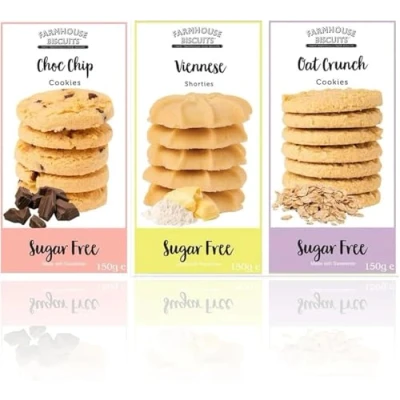Farmhouse Sugar Free Multipack Cookies Pack of 3 Biscuits Bundle Available for Gifts & Hampers Diabetic Friendly Friends Family Chocolate Chip, Viennese Shorties, Oat Crunch