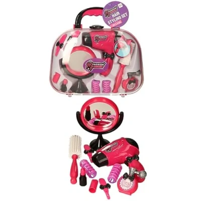 COMPLETE SET: Fashion Studio hair styling play set includes a toy hair dryer, mirror, brush, hair clips, rollers and beauty accessories in a portable carrying case EDUCATIONAL VALUE: Perfect role-play toy that helps develop imagination, creativity and social skills while children pretend to run their own beauty salon AGE APPROPRIATE: Specially designed for children aged 3 years and above, with safe, child-friendly materials and rounded edges PORTABLE DESIGN: Comes in a sturdy pink carrying case with handle for easy storage and transport of all styling accessories REALISTIC FEATURES: Includes a standing vanity mirror, toy hair dryer with realistic styling attachments, and decorative beauty accessories in vibrant pink colours, Manufacturer: Atoz