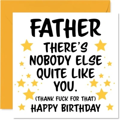 MAKE YOUR FATHER SMILE WITH THIS UNIQUE BIRTHDAY CARD: This exceptional quality Father birthday card shows the design 'Father Theres nobody else quite like you. (Thank fuck for that) Happy Birthday'. If you are looking for an awesome birthday card for Father, then then this happy birthday Father card is bound to make them smile. Not just a birthday card for Father this could also be a birthday gifts for Father, Dad or Daddy. WHAT DO YOU GET: The card is printed on one side and BLANK ON THE INSIDE to allow you to write your very own message. The unique fun design is printed on a specially sourced and environmentally responsible board. At 360 microns thick the natural white one-sided gloss board has a quality look and feel. Supplied with a coloured gummed envelope to complement the design and ready to be sealed and sent in the post. Great Father birthday cards, Dad birthday card. NO INK SMUDGES: There is nothing worse than writing inside a card to find that the shiny surface makes the ink smudge. This is why we use a high quality one sided coated board. The uncoated side will absorb more of the ink from your pen to make smudging a thing of the past. Father birthday cards, Father birthday cards from Son. SIZES: Greeting Card = 145mm x 145mm, Envelope = 155mm x 155mm, Card Thickness = 360 micron. Happy birthday Father, Fathers birthday card, Father cards birthday, birthday card Father, happy birthday Father card, Father gifts from Son. MADE AND QUALITY CHECKED IN THE UK: We print and manufacture all our products right here in the UK so you can be sure of a fast turnaround and a product that is expertly made. Using environmentally responsible premium board our card is conscious of the responsible management of the world's forests - happy birthday card Father, Father birthday cards.