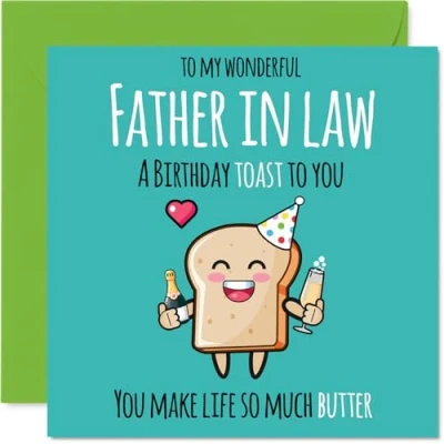 MAKE YOUR FATHER IN LAW SMILE WITH THIS UNIQUE BIRTHDAY CARD: This exceptional quality Father in Law birthday card shows the design 'To my wonderful Father in Law a birthday toast to you. You make life so much better'. If you are looking for a beautiful birthday card Father in Law, then then this happy birthday Father in Law card is bound to make them smile. Not just a birthday card for Father in Law this could also be a birthday gifts for Father in Law, Dad or Father. WHAT DO YOU GET: The card is printed on one side and BLANK ON THE INSIDE to allow you to write your very own message. The unique fun design is printed on a specially sourced and environmentally responsible board. At 360 microns thick the natural white one-sided gloss board has a quality look and feel. Supplied with a coloured gummed envelope to complement the design and ready to be sealed and sent in the post. Father in Law Fathers Day cards, Dad birthday cards, Father birthday card. NO INK SMUDGES: There is nothing worse than writing inside a card to find that the shiny surface makes the ink smudge. This is why we use a high quality one sided coated board. The uncoated side will absorb more of the ink from your pen to make smudging a thing of the past. Father in Law birthday cards, Father in Law birthday cards from Son. SIZES: Greeting Card = 145mm x 145mm, Envelope = 155mm x 155mm, Card Thickness = 360 micron. Happy birthday Father in Law, Father in Laws birthday card, Father in Law cards birthday, birthday card Father in Law, happy birthday Father in Law card, Father in Law gifts from Son. MADE AND QUALITY CHECKED IN THE UK: We print and manufacture all our products right here in the UK so you can be sure of a fast turnaround and a product that is expertly made. Using environmentally responsible premium board our card is conscious of the responsible management of the world's forests - happy birthday card Father in Law, Father in Law birthday cards.