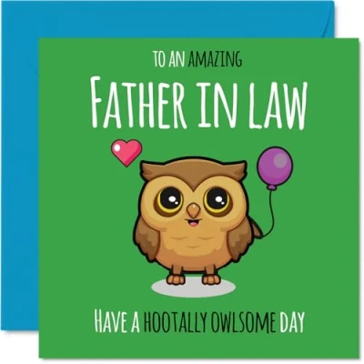 MAKE YOUR FATHER IN LAW SMILE WITH THIS UNIQUE BIRTHDAY CARD: This exceptional quality Father in Law birthday card shows the design 'To An Amazing Father in Law Have Hootally Owlsome Day'. If you are looking for an awesome birthday card for Father in Law, then then this happy birthday Father in Law card is bound to make them smile. Not just a birthday card for Father in Law this could also be a birthday gifts for Father in Law, Dad or Father. WHAT DO YOU GET: The card is printed on one side and BLANK ON THE INSIDE to allow you to write your very own message. The unique fun design is printed on a specially sourced and environmentally responsible board. At 360 microns thick the natural white one-sided gloss board has a quality look and feel. Supplied with a coloured gummed envelope to complement the design and ready to be sealed and sent in the post. Great Father in Law birthday cards, Dad birthday card. NO INK SMUDGES: There is nothing worse than writing inside a card to find that the shiny surface makes the ink smudge. This is why we use a high quality one sided coated board. The uncoated side will absorb more of the ink from your pen to make smudging a thing of the past. Father in Law birthday cards, Father in Law birthday cards from Son. SIZES: Greeting Card = 145mm x 145mm, Envelope = 155mm x 155mm, Card Thickness = 360 micron. Happy birthday Father in Law, Father in Laws birthday card, Father in Law cards birthday, birthday card Father in Law, happy birthday Father in Law card, Father in Law gifts from Son. MADE AND QUALITY CHECKED IN THE UK: We print and manufacture all our products right here in the UK so you can be sure of a fast turnaround and a product that is expertly made. Using environmentally responsible premium board our card is conscious of the responsible management of the world's forests - happy birthday card Father in Law, Father in Law birthday cards.