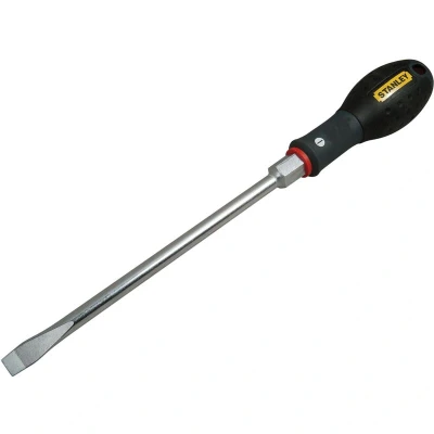 General description The Stanley Tools FatMax Flared Tip Bolster Screwdriver is a heavy-duty tool designed for professional and DIY applications. It features a durable construction with a chrome vanadium steel bar that resists bending and snapping. The screwdriver is ergonomically designed with a tri-material handle for comfort and grip, allowing for efficient and fatigue-free work. The tips are hardened for durability and precision machined for an excellent fit with fasteners. Technical specifications Type: Flared Blade length: 150 mm Blade width: 6.5 mm Material: Chrome-vanadium steel Compatibility and accessories Features a hexagonal tip to increase torque when used with a wrench Includes a suspension eyelet for easy storage Installation No installation required; ready to use out of the box Usage Ideal for driving screws with a 6.5 mm head Suitable for professional and DIY applications requiring high torque and precision