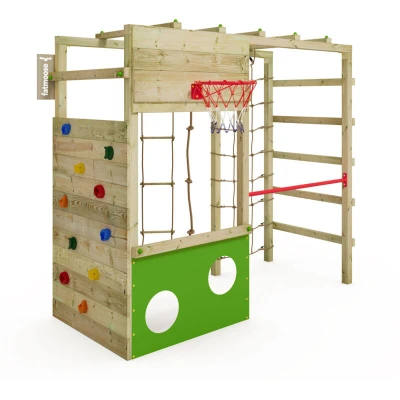 Fatmoose CleverClimber Club XXL – the sporty climbing paradise for the garden GARDEN PLAYGROUND – XXL climbing frame with versatile climbing, gym and training options for active children. 7 PLAY OPTIONS – Climbing wall, climbing ladder, climbing net, rope ladder, climbing rope, horizontal bar and basketball hoop. SPORT & MOVEMENT – Encourages strength, coordination, balance and endurance – ideal for young climbing enthusiasts. ROBUST & WEATHER-RESISTANT – Pressure-treated solid wood for long-term outdoor use. SECURE YOUR WARRANTY – To qualify for the full 10-year warranty*, use the separately available FATMOOSE SolidRoot ground anchors (6 pcs.) for extra stability and safety. The FATMOOSE CleverClimber Club XXL is the perfect climbing frame for children who enjoy sporty, varied and challenging play. Whether on the climbing wall, the large climbing net or the climbing rope – children playfully train strength, coordination and body awareness. Young acrobats can show their skills on the