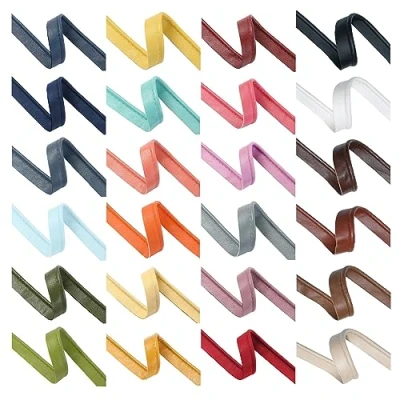 Plain Edge Faux Leather Piping. PU fabric with soft smooth handle, perfect for light Upholstery. 8 Earthy Colours The piping can be used inserted just to show the piped edge OR used as a edge trip border with piped edge as border and the plain edge as feature next to the edge . UNIQUE!! The Neotrims Plain trim is a new addition to the Serrated Zig Zag piping (n10878) and the Crochet Pu Tape (n10832) which all have the same colours. The PU tapes are strong and resilient and washable once applied to a cloth or material Neotrims is a trademark registered in UK. A British Brand, Stunning Fabrics & Trimmings