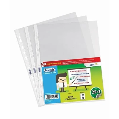 Transparent folder with holes in polypropylene (non-toxic plastic), top opening and white reinforcement band; useful size 22 x 30 cm, can hold several A4 sheets Linear thickness: resistant for excellent protection of the contents; Made in Italy Transparent file folders with holes, smooth finish and excellent transparency, make documents visible immediately; avoid photocopy effect as toner does not stick to the envelope The envelopes with holes (or carpets) are suitable for intensive use in the office, home and school, your stationery always at hand Great for filing documents in 2, 3 and 4 ring binders, lever recorders and folders