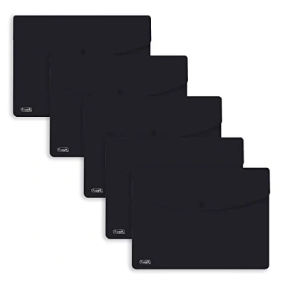 A4 button envelopes made of high thickness opaque polypropylene in classic colours Colour colour snap button closure They are indispensable for protecting and transporting documents or various objects Available in 5 colours: black, green, blue, red and light blue Pack of 5