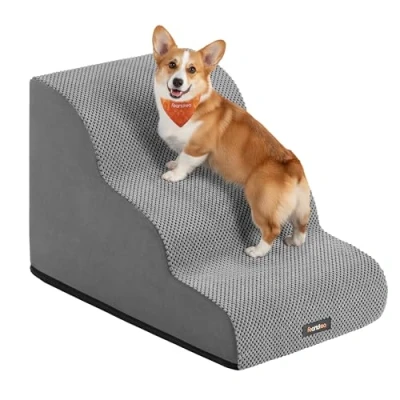 Feandrea 3 Step Dog Stairs, Waffle Patterned Corduroy Steps for Bed, Sofa, Waterproof Pet Stairs with Anti Slip Designs, Gentle Slope, Removable Washable Cover, Handle, Dove Grey PPS013GD01