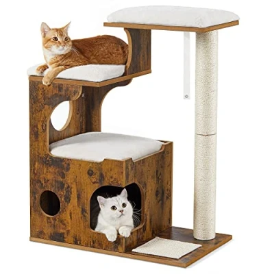 Vintage Now Also for Cats: The dark wood veneer of this cat tree, as well as the contrasting white fuzzy pads, lend this piece of cat furniture the flair of a rustic, snow-covered mountain hut For Clean Cuddly Cats: The cuddly cushions are attached to the platforms and in the cottage with hook-and-loop fasteners. They are also easy to remove and easy to clean Where’s Whiskers’ Favourite Spot? On one of the spacious perches of the cat tower, or in the spacious cat cave? No matter which place your cat chooses, the cat condo always offers the highest stability due to the stable MDF boards Claw Sharpness Test: The post of this cat tree is completely wrapped in sisal. Your cat can sharpen her claws to her heart’s content on this and the small scratch mat—better than on your sofa, isn’t it? Make Your Cats Happy: Spoil your cats with this cat tree so they won't feel lonely when you’re away, and let them play and relax in comfort