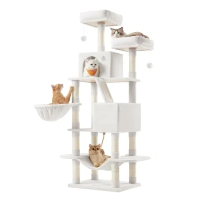 168 cm Tall, Endless Climbing Fun: 168 cm tall. 5 levels. Short 25-30 cm distance between levels. This plush cat tree is ideal for cats who love climbing and high places, but it’s also easy to climb All-in-One Playground: With 2 padded perches, 2 caves, 2 pompoms, and 1 hammock, cats of different characters can all find their fave spot on this multi-level cat villa—perfect for multi-cat homes Stable, Safe, Secure: With quality particleboard, a large base with reinforced bottom battens, and an anti-tip kit, this tall cat condo is stable and safe for up to 6 cats (max. 5 kg each) to play 14 Scratching Zones: Cats love to scratch. With scratching areas on each level, they can scratch to their hearts' content and let your sofa go! The scratch ramp doubles as a ladder for easy climbing Easy to Assemble: With a simple structure, step-by-step instructions, and labelled parts, assembling this tall cat tree is as easy as building blocks