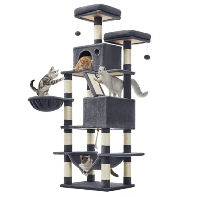 Feandrea Cat Tree, 168 cm Large Tower with 13 Scratching Posts, 1 Ramp, 2 Perches, Caves, Basket, Hammock, Pompoms, Multi Level Plush Condo for Indoor Cats, Smoky Grey PCT165G01