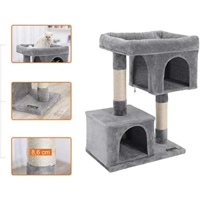 Large Perch: This cat tree features a large 56 x 40 cm perch, offering roomy space for your cat to stretch out. Ideal for 1 large cat or 2 small cats snuggling together 2 Cat Caves: The upper 2-door cave offers a wide view and easy access. The lower single-door cave is a hideaway for sleepyheads to take a nap and is also great for older cats and kittens Climb. Scratch. Relax. All in One: The multi-level design lets cats climb easily. 2 scratching posts meet cats’ instincts. The top perch is great for bird watching. 2 caves let them relax in comfort Easy to Assemble: Thanks to the simplified structure, you can set this cat tower for indoor cats up yourself in just a few steps! Sturdy, Stable, Safe: Sturdy particleboard for durability, a large base for stability, and an anti-tip kit for security—this cat condo offers a safe playground for cats to play