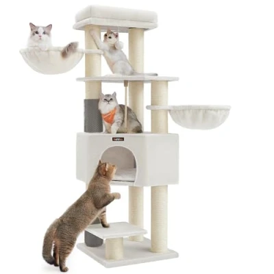 Feandrea Cat Tree for Large Cats, Heavy Duty Tower with Self Warming Pads, 2 Groomers, 9 Scratching Posts, Perch, Cave, Baskets, 50 x 160 cm, Cream White and Beige PCT003W02
