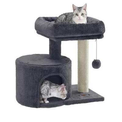 Climbing or Scratching Fun? No need to choose between them. This compact cat tree, with its fully wrapped sisal post, offers both exploration and scratching enjoyment Have a Sweet Dream: After a stroll through the garden, it’s a blessing for every kitten to rest on the fluffy, oh-so-soft, plush perch or in the spacious cuddle cave of the cat tower. They’ll probably even dream of a luxurious massage Trust Its Stability: This is a small but stable cat condo. Thanks to its quality particleboard and the reinforced base, this cat tree will be a great companion during your cat’s growth Easy to Assemble: With a simple structure, step-by-step instructions, and labeled parts, assembling this cat play tower is as easy as building blocks Make Your Cats Happy: Spoil your cats with this scratching tree so they won't feel lonely when you’re away, and let them play and relax in comfort