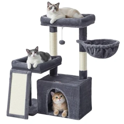 Ideal for Multi-Cat Families: 2 cosy cat beds, a snug cave, and a comfy basket give each cat a place to relax, curl up, and claim their own corner on this cat tree Scratch, Stretch, Repeat: With 2 scratching posts and a scratching board, this cat tower gives your cats dedicated spots to dig in their claws while helping keep your furniture safe Comfort All Around: Fully wrapped in soft plush fabric and comfortably sized for small to medium cats, this cat tree tower creates snug, inviting spots where they can settle in for true relaxation Easy Climbing for All Cats: Designed with multiple levels, thoughtful pathways, and a scratching board that doubles as a ladder, even kittens and senior cats can climb and explore this cat playground with ease Stable and Secure: Built with sturdy particleboard and secured with an anti-tip kit, this cat condo for indoor cats offers a safe, stable space for your feline friends to jump, chase, and play