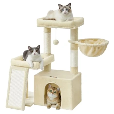 Ideal for Multi-Cat Families: 2 cosy cat beds, a snug cave, and a comfy basket give each cat a place to relax, curl up, and claim their own corner on this cat tree Scratch, Stretch, Repeat: With 2 scratching posts and a scratching board, this cat tower gives your cats dedicated spots to dig in their claws while helping keep your furniture safe Comfort All Around: Fully wrapped in soft plush fabric and comfortably sized for small to medium cats, this cat tree tower creates snug, inviting spots where they can settle in for true relaxation Easy Climbing for All Cats: Designed with multiple levels, thoughtful pathways, and a scratching board that doubles as a ladder, even kittens and senior cats can climb and explore this cat playground with ease Stable and Secure: Built with sturdy particleboard and secured with an anti-tip kit, this cat condo for indoor cats offers a safe, stable space for your feline friends to jump, chase, and play