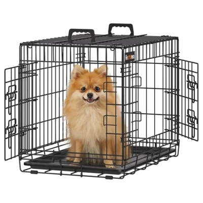 Safe and Comfortable: Crafted of durable, strong metal wire and finished with a smooth, rust-resistant surface with no sharp edges, this small dog crate provides a safe and comfortable space for your dog Double Doors, Double Locks, Double Security: With 2 doors, this dog cage makes it easier for your fur friend to get in and out. The double L-shaped locks prevent your fur friend from opening the doors itself Choose the Right Size: This 61 x 43.5 x 50.5 cm wire dog crate is ideal for dogs up to 11 kg. Recommended breeds: Chihuahua, Toy Poodle, Pomeranian, etc. Please read our measuring tips in the notes for choosing the right size Easy to Assemble, Easy to Move: No tools required, simply unfold it and attach the clip locks, and it’s ready. The foldable design and 2 handles on the top make it easy to transport Easy to Clean: The foldable dog crate comes with a pull-out tray on the bottom, so you can easily slide it out for cleaning and keep your dog’s place clean