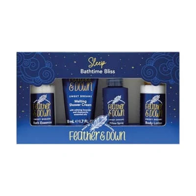 Feather & Down Bathtime Bliss Gift Set (Shower Cream, Pillow Spray, Bath Essence Body Lotion) With calming lavender chamomile essential oils. Vegan Friendly Cruelty Free.
