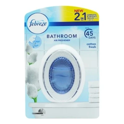 Give your bathroom a breath of fresh air with this beautifully scented Febreze 2in1 Bathroom Air Freshener. The 2in1 formula eliminates and prevents odours lingering for up to 45 days, so you can enjoy a fragrant and fresh bathroom every day.. 2in1 formula. Lasts for up to 45 days. Rejuvenating Cotton Fresh scent