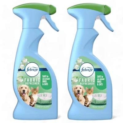 PET ODOUR ELIMINATION MULTIPACK: This convenient bundle contains 2 x 375ml spray bottles of Febreze Fabric Refresher designed specifically for tackling pet smells, giving you a total of 750ml. FIGHTS TOUGH SMELLS, DOESN'T MASK: Don't just cover up dog and cat odours. Febreze's OdourClear technology seeks out tough, lingering smells trapped in fabrics and eliminates them completely to ensure they don't come back. FOR HARD-TO-WASH FABRICS: The perfect solution for refreshing items you can't put in the washing machine. Ideal for use on sofas, curtains, carpets, pet beds, car seats, and upholstery. PET-SAFE FORMULA: The water-based formula is dermatologically tested and safe to use on fabrics around cats and dogs when used as directed. LIGHT FRESH SCENT: Leaves your fabrics smelling clean with a light, pleasant fresh fragrance, restoring an inviting atmosphere to your home.
