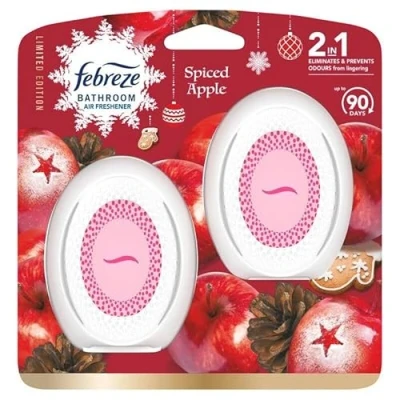 Febreze Bathroom Air Freshener fights odours and leaves a light fresh scent Long-lasting for up to 90 days - Twin Pack Easy to use, One push button activation and No battery or electricity needed Spiced Apple fragrance is inspired by the original Lenor scent, to enhance your bathroom in a freshness