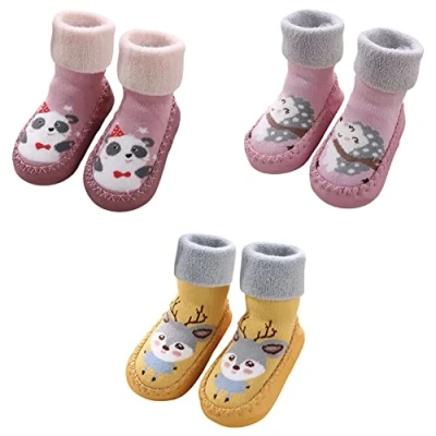 FedMois 3 Pairs Baby Winter Thermal Thick Anti slip Indoor Slipper Shoes Socks, deer, hedgehog and panda, 0 6 months