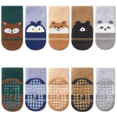 FedMois 5 Pairs Baby Kids Anti slip Socks Cotton non skid Ankle Animals, Stripes, 7 years
