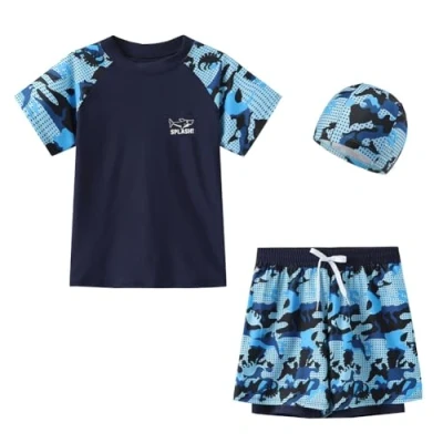 FedMois Boy Swim Set, 3 Pieces Set Shirt + Swimming Shorts with Compression Liner Cap, Blue, 7 9 Years (4XL)