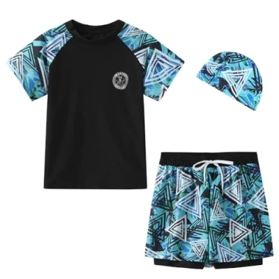 FedMois Boy Swim Set, 3 Pieces Set Shirt + Swimming Shorts with Compression Liner Cap, Green, 12 13 Years (7XL)