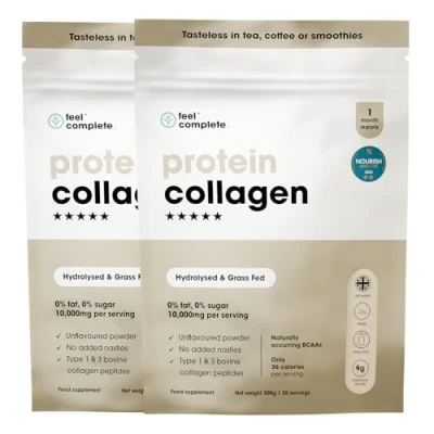 TYPE 1 & TYPE 3 HYDROLYSED BOVINE COLLAGEN: Feel Complete High Protein Bovine Collagen stands as an exemplary addition to health-conscious diets, boasting a 0% fat and 0% sugar. 9g of protein per 10g of collagen and only 36 calories per serving, it serves as a low-impact, high-gain supplement that aligns perfectly with ketogenic, paleo, and low-carb diets. Our High Protein Bovine Collagen is halal, dairy free, kosher and gluten free. AIDS MUSCLE REPAIR: Feel Complete High Protein Bovine Collagen contains 9g of protein per 10g serving which supports muscle repair, making it a favoured choice for individuals engaged in regular physical exercise. Beyond the physical benefits, the supplement can help gut health and optimise metabolic functions. HELPS SUPPORT OVERALL WELLBEING: Rich in essential amino acids, this collagen supplement is adept at supporting joint health, thereby reducing discomfort and improving mobility. Incorporating Feel Complete High Protein Bovine Collagen into your daily diet offers a comprehensive approach to holistic health, underpinned by scientific efficacy and natural ingredients. TASTELESS & ODORLESS: Remarkably tasteless, odourless and free from preservatives, it can be seamlessly incorporated into a variety of drinks and foods, offering ease and flexibility. PROMOTES HEALTHY SKIN, HAIR & NAILS: This collagen supplement is an elixir for enhancing the quality of skin, hair, and nails. Its high collagen content is instrumental in combating the signs of ageing, providing a youthful appearance through improved skin elasticity and hydration. Our Higher Protein Bovine Collagen pouches are made with recyclable packaging.
