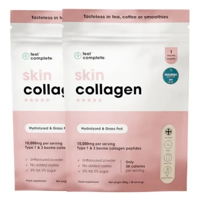 TYPE 1 & TYPE 3 HYDROLYSED BOVINE COLLAGEN: Feel Complete Collagen Supplements redefine your beauty and wellness journey. Our Type 1 and Type 3 Hydrolysed bovine collagen is your passport to radiant hair, skin, nails, and muscles. 0% fat and 0% sugar. 9g of protein per 10g of collagen. Only 36 calories per serving. AGE GRACEFULLY, AGE BEAUTIFULLY: Unveil the natural anti-aging powerhouse of collagen peptides. They work from within, enhancing skin elasticity, reducing wrinkles, and boosting overall skin health. Recommended for Ages 20-60 especially for those focused on beauty and wellness, mindful of calorie consumption, and understanding the product's numerous benefits. INCLUDES ESSENTIAL AMINO ACIDS: Elevate beyond skin-deep beauty. Strengthen hair, fortify nails, and aid muscle recovery. Not Suitable for Vegetarians/Vegans, this product is derived from bovine collagen. Feel Complete Bovine Collagen is dietary friendly and is Halal, Kosher, Dairy Free, Gluten Free & Nut Free this low calorie collagen supplement is only 36 calories per serving. PURE & UNFLAVORED GOODNESS: Simplicity is key. Feel Complete maintains purity with no artificial additives or sweeteners. It's pure Hydrolysed bovine collagen and mixes seamlessly with your preferred drinks and recipes. Customise your collagen routine your way. WELLNESS IN EVERY SERVING: Integrate Feel Complete into your daily wellness regimen. Blend it into your morning smoothie or stir it into your evening tea, this collagen is sourced from bovines and is 100% hydrolysed for easy dissolution in hot or cold liquids. You're nourishing your body with premium collagen, experiencing wholeness from the inside out. It's time to Feel Complete, in every sense.