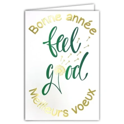 Feel Good New Year Best Wishes Card in Shiny Gold Glitter with White Envelope Size 12 x 17.5 cm Dandelion Seeds Wind Party Made France