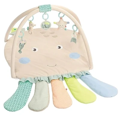 The soft play mat with 5 removable toys offers the baby fun from birth in the different growth phases - the perfect first play mat for world explorers Rattle, squeaker, rustling paper, mirror, soft biter and animal voice playfully promote baby's senses and awaken natural curiosity to grasp, cuddle and play Promote the sense of gripping and touching: the hanging toys on the bows are easy for small baby hands to grip and playfully increase the motor skills of the baby from birth The crawling blanket in octopus shape is cuddly soft and protects girls and boys optimally when exploring the underwater world of sea children Box contents: 1 x 3D octopus activity blanket, size: approx. 120 x 80 cm / Outer material: velour, printed fabric, muslin, bouclette / Underside: 100% polyester / 30°C gentle wash / Item No. : 054149
