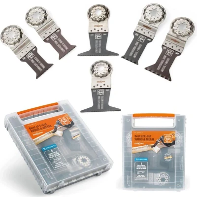 The Fein 35222967010 is a versatile 6-piece E-Cut plunge-cut saw blade set, specifically designed for cutting through both wood and metal. This blade set offers a practical solution for both professionals and DIY enthusiasts, combining durability and efficiency in one package.
