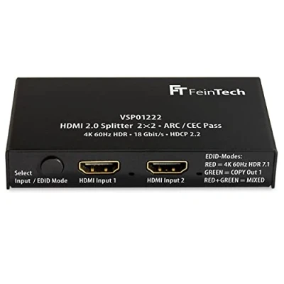 FeinTech VSP01222 HDMI 2.0 Splitter 2 Inputs Outputs Scaler ARC Pass for AV Receiver 4K 60Hz HDR