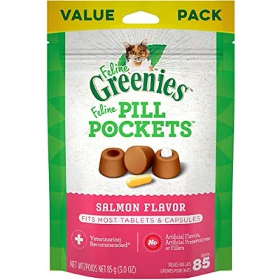 Contains one (1) 3 oz. 85-count value size pack of FELINE GREENIES PILL POCKETS Natural Cat Treats Salmon Flavor that are perfect for medicine tablets or capsules; MADE WITH NATURAL INGREDIENTS plus trace nutrients FELINE GREENIES Pill Pockets are the tasty, smarter way to help your feline friend’s medicine go down-no claws necessary Your kitty won't know what's hidden inside: These Pill Pocket Treats mask the smell and taste and come in a delectable salmon flavor cats adore Pill Pockets Cat Treats are easy to use: Just drop medicine inside the pocket, pinch closed, and share with your cat for a stress-free experience FELINE GREENIES Pill Pockets are a vet-recommended* pill-giving hack you and your cat will loveNow in a value-size option for cat parents who are on daily medication