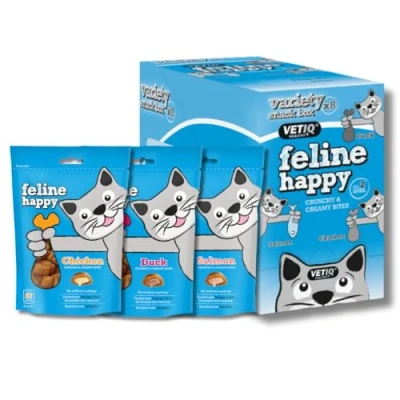 Feline Happy Cat Treats Variety Pack, 8 x 60g Pouches, Chicken, Salmon and Duck Flavours with Omega 3 & 6