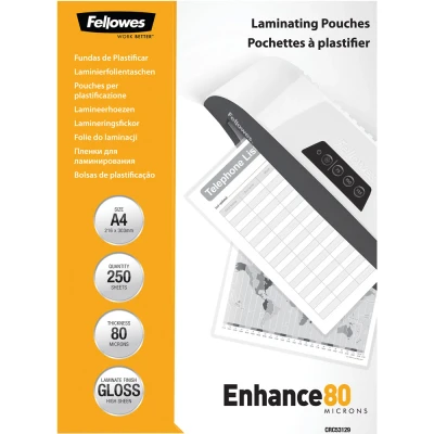 Fellowes A4 Laminating Pouches, Gloss, 160 Micron (2 x 80 Micron) Pack of 250, clear