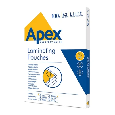 GIVE YOUR WORK A PROFESSIONAL FINISH - These premium quality A3 laminating pouches give your work a professional finish and provide protection for notices and photos needing to be displayed. GLOSSY FINISH - It is important that you select the pouches that are suited to your specific application - a gloss finish creates an extremely versatile, high quality look which is ideal for most laminating jobs. GREAT QUALITY - This Apex Light Duty A3 laminating pouch is designed for use at 80 Micron setting and compatible with all popular brands of laminators, perfect for use at home or in the office. PROTECTS YOUR WORK - One of the best reasons to laminate is to Capture your documents whether it be a photo, important work, notices or protecting your documents from spillages, rips and everyday wear and tear. LARGE PACK - This product comes in 1 pack containing 100 laminating pouches giving you greater value for money.
