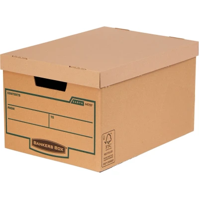 Bankers Box™ by Fellowes Earth Series Large Storage Box are sturdy recycled corrugated boxes that are easy to set up manually. With a double layer of board to end panels and base they are ideal for transporting files and can accommodate 5 x 80mm A4 Earth Series transfer files; great for when you need a long term storage solution. When you choose Earth Series you can be rest assured you are picking filing and storage products that don't cost the earth; the Bankers Box™ Earth Series storage boxes are made from FSC™ certified board and are 100% recyclable. All inks used are water based and adhesives used are solvent free.