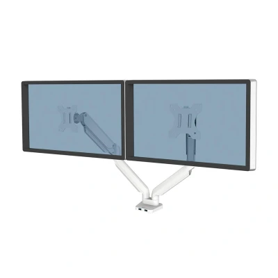 Fellowes Dual Monitor Arm Platinum Series Mount for Two 8KG 32 inch Screens Ergonomic Adjustable Desk Tilt 45 Swivel 360 Rotation 360, VESA 75 x 75/100 100 White