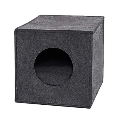 𝗜𝗗𝗘𝗔𝗟 𝗥𝗘𝗧𝗥𝗘𝗔𝗧. Whether as a shelf cave or free-standing in the room - your cat will be happy to retreat into it and feel at home. 𝗛𝗜𝗚𝗛-𝗤𝗨𝗔𝗟𝗜𝗧𝗬 𝗪𝗢𝗥𝗞𝗠𝗔𝗡𝗦𝗛𝗜𝗣. With a wall thickness of 5 mm and high-quality sewn felt, the cat cave offers an all-round safe feeling and is very stable. 𝗦𝗨𝗜𝗧𝗔𝗕𝗟𝗘 𝗙𝗢𝗥 𝗦𝗛𝗘𝗟𝗩𝗘𝗦. You can use the foldable cave in some shelves, such as the Ikea Kallax/Expedit. The diameter of the cave entrance is 17 cm. 𝗢𝗣𝗧𝗜𝗢𝗡𝗔𝗟𝗟𝗬 𝗪𝗜𝗧𝗛 𝗖𝗨𝗦𝗛𝗜𝗢𝗡. The cosy cave comes with a soft cushion with a removable cover. The comfortable felt provides warmth and cosiness on its own. 𝗗𝗜𝗠𝗘𝗡𝗦𝗜𝗢𝗡𝗦. With dimensions of 33x37x33 cm, this cuddly cube can be set up anywhere and is very space-saving thanks to its foldability. You can choose between a light grey or dark grey cave, with or without a cosy cushion.