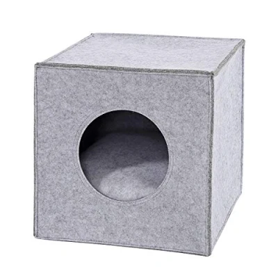 𝗜𝗗𝗘𝗔𝗟 𝗥𝗘𝗧𝗥𝗘𝗔𝗧. Whether as a shelf cave or free-standing in the room - your cat will be happy to retreat into it and feel at home. 𝗛𝗜𝗚𝗛-𝗤𝗨𝗔𝗟𝗜𝗧𝗬 𝗪𝗢𝗥𝗞𝗠𝗔𝗡𝗦𝗛𝗜𝗣. With a wall thickness of 5 mm and high-quality sewn felt, the cat cave offers an all-round safe feeling and is very stable. 𝗦𝗨𝗜𝗧𝗔𝗕𝗟𝗘 𝗙𝗢𝗥 𝗦𝗛𝗘𝗟𝗩𝗘𝗦. You can use the foldable cave in some shelves, such as the Ikea Kallax/Expedit. The diameter of the cave entrance is 17 cm. 𝗢𝗣𝗧𝗜𝗢𝗡𝗔𝗟𝗟𝗬 𝗪𝗜𝗧𝗛 𝗖𝗨𝗦𝗛𝗜𝗢𝗡. The cosy cave comes with a soft cushion with a removable cover. The comfortable felt provides warmth and cosiness on its own. 𝗗𝗜𝗠𝗘𝗡𝗦𝗜𝗢𝗡𝗦. With dimensions of 33x37x33 cm, this cuddly cube can be set up anywhere and is very space-saving thanks to its foldability. You can choose between a light grey or dark grey cave, with or without a cosy cushion.